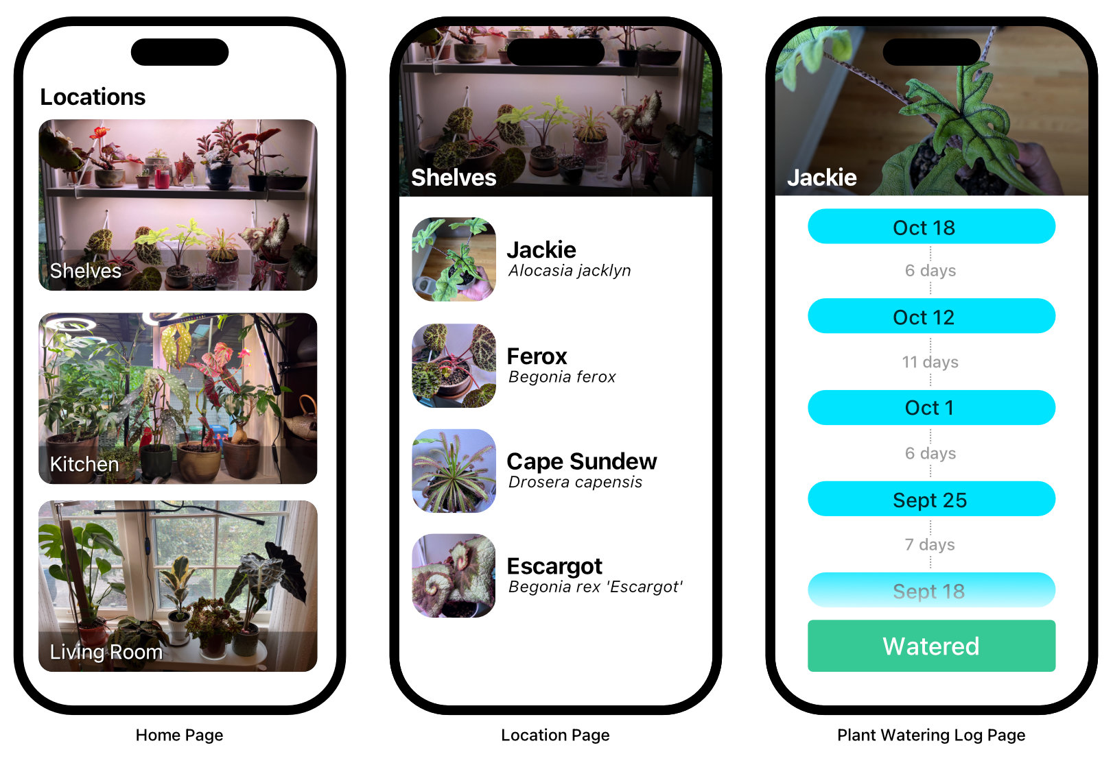 The app is still pretty simple. Each user has a list of plants in their collection. Each plant can be in a different custom location (bedroom, kitchen, living room). And each plant has a log of when it was last watered.
